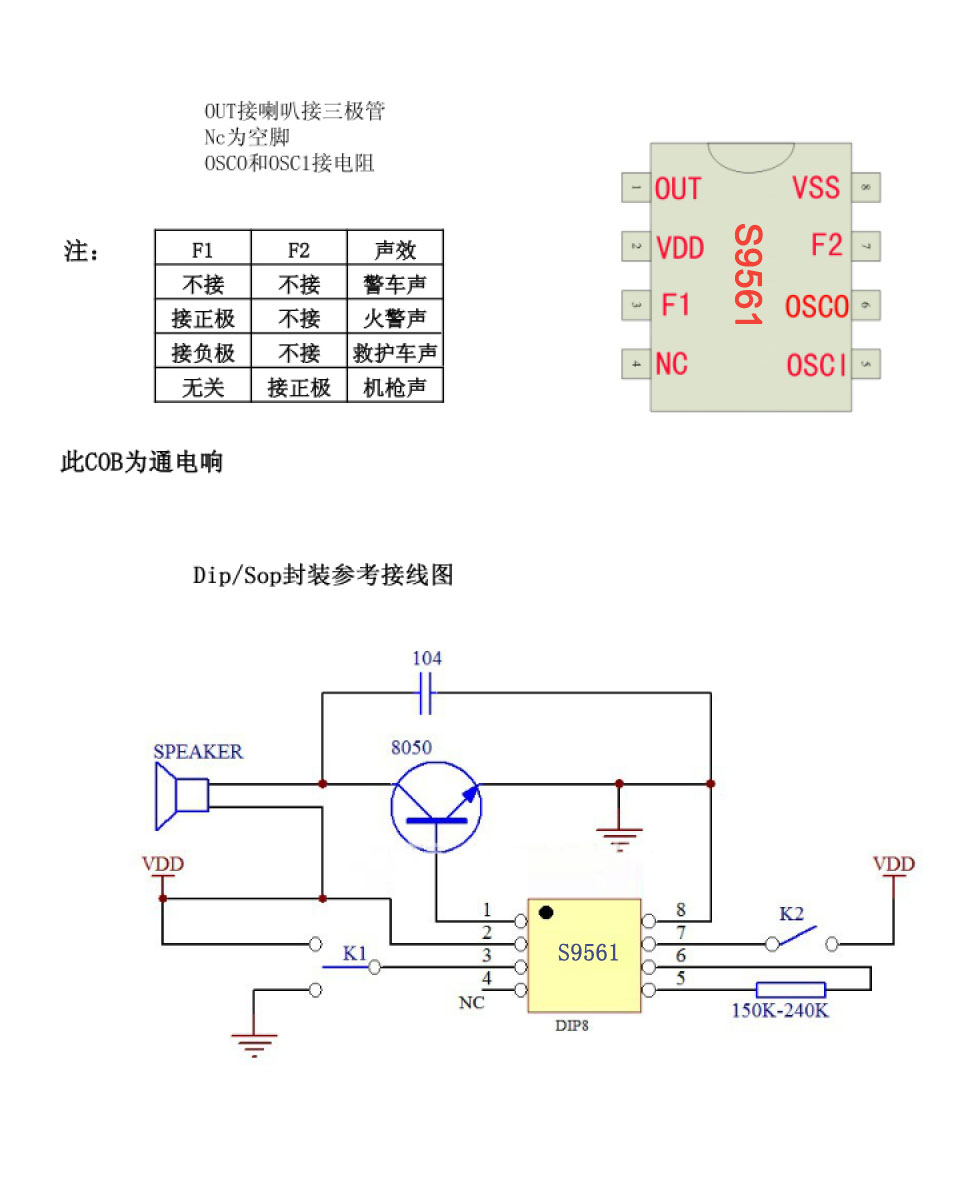 四聲報警9561芯片接線圖、倒車語音喇叭電路圖